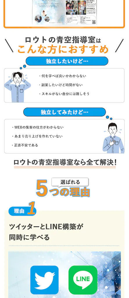 選ばれる5つの理由:わかりやすい様に有料素材とアイコンなどを使用しています。スマホの1画面に1理由が入るようにしています。