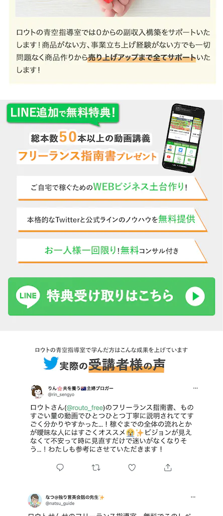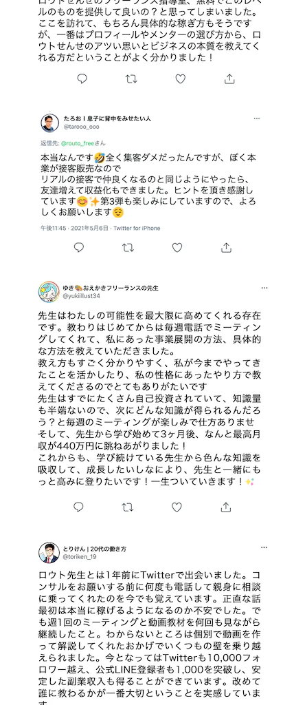 受講者の声:Twitterのスクリーンショットで信頼感をUPしています。