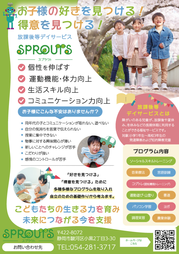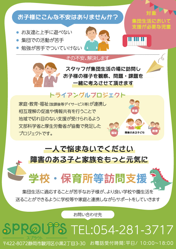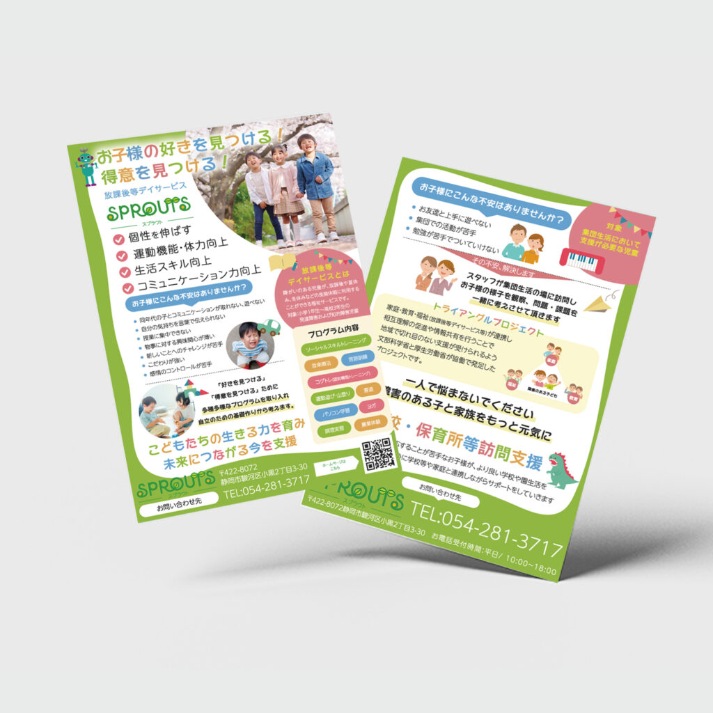 チラシの目的:以前別々にお願いした放課後デイサービスと保育所等訪問支援をA4両面にしたデザインをと考えております。