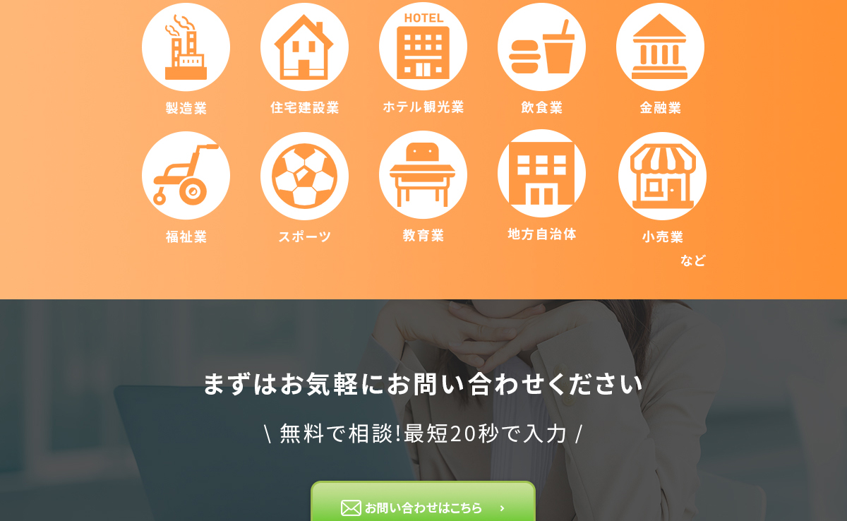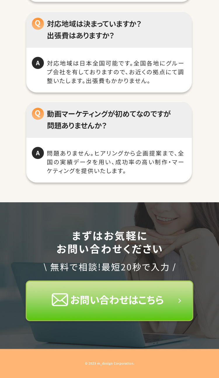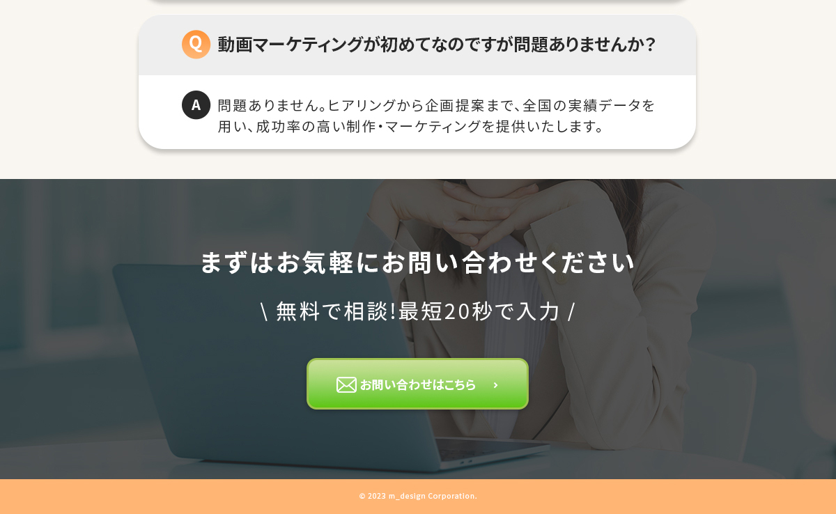 お問い合わせの部分は背景から色味を変えてスクロールが止まるようにしております。