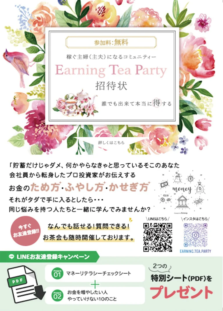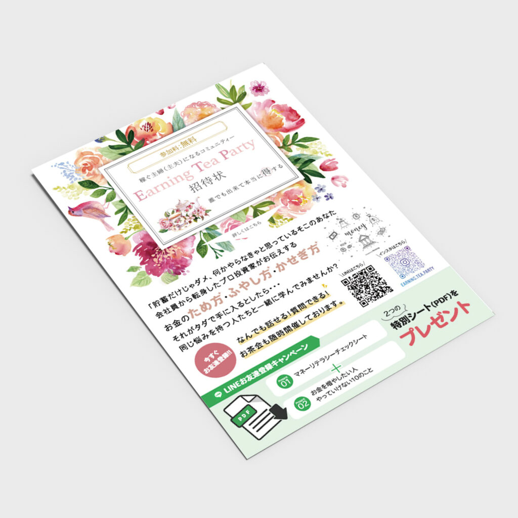 上部---招待状の素材で目立つ素材を採用致しました。イベントの名前がEarnung Tea Partyなのでティーの素材を入れて雰囲気が伝わる様にしています。