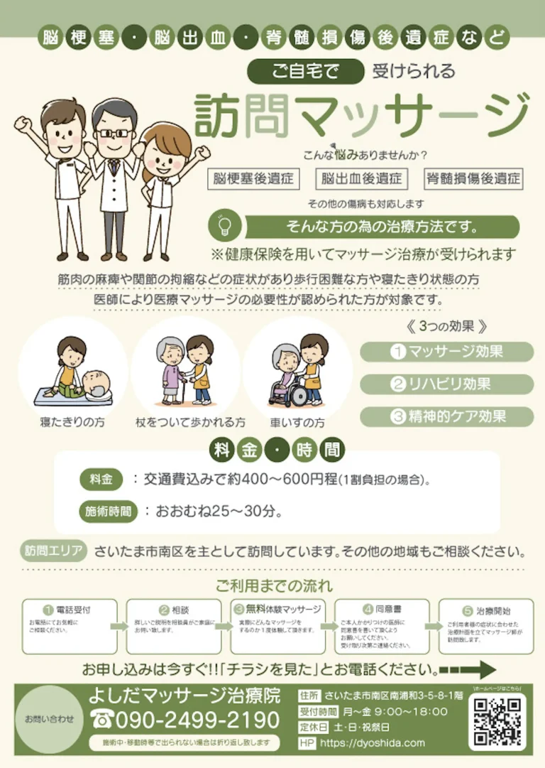 何のチラシかわかる様に「訪問マッサージ」のキャッチを大きくデザイン