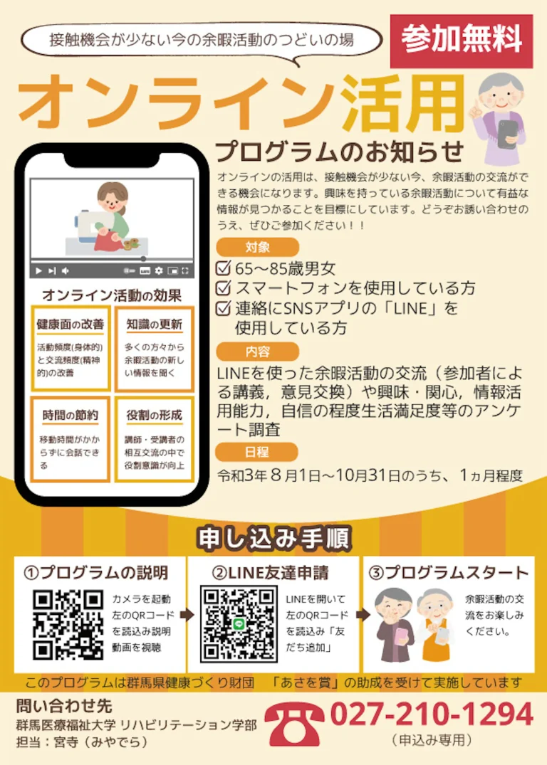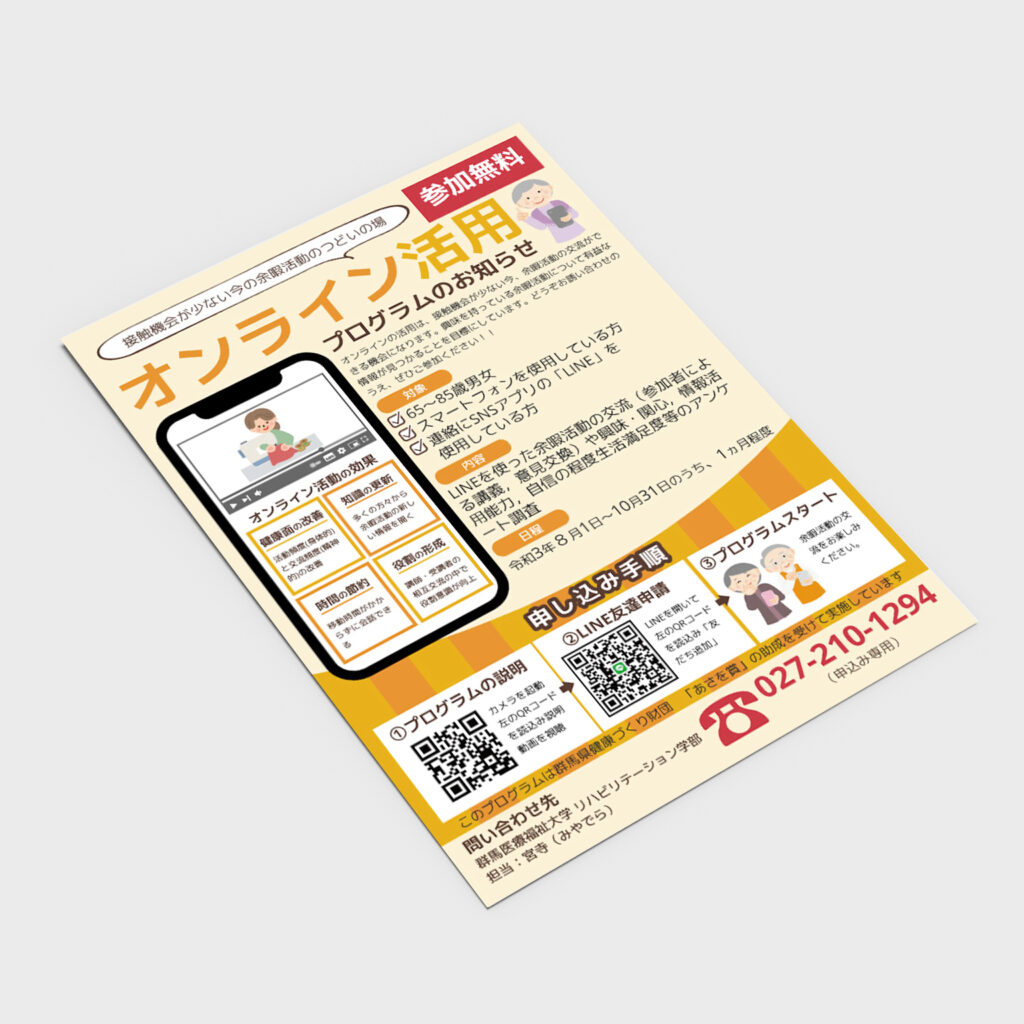 フォント:ターゲットが高齢者なので読みやすいゴシックを採用 ターゲットが高齢者なので出来るだけ文字を大きくして読みやすいを意識しています。無料参加なので目立つように色を変えています。スマートフォンを使用して参加する活動なのでスマートフォン画面の素材を採用しています。イラストを使用して親近感もUPしています。申し込み手順もわかりやすいようにLINEの友達申請のやり方など詳しく記載しています。