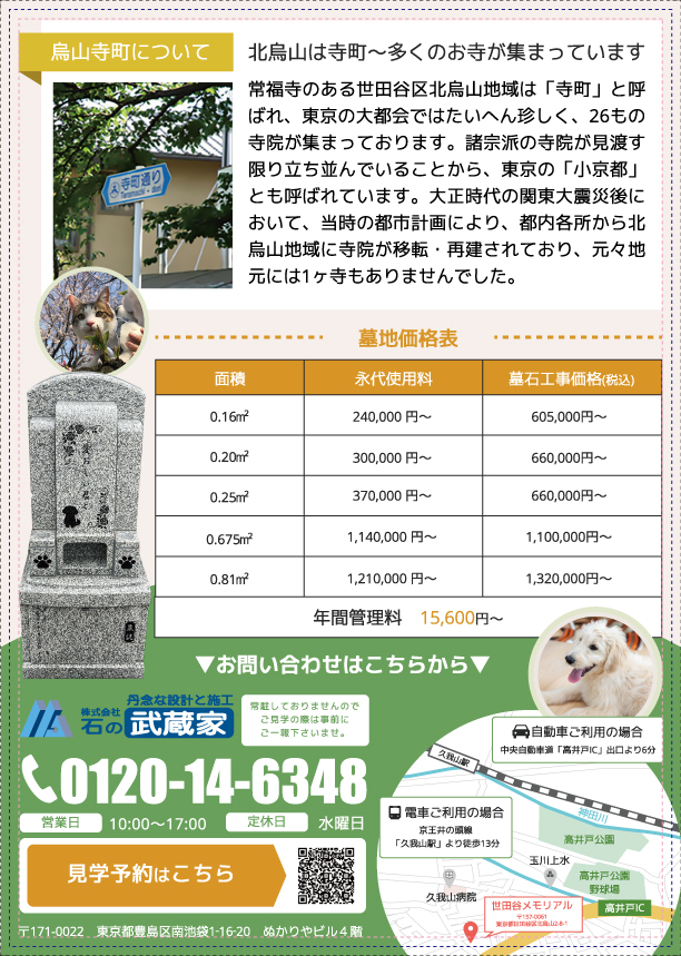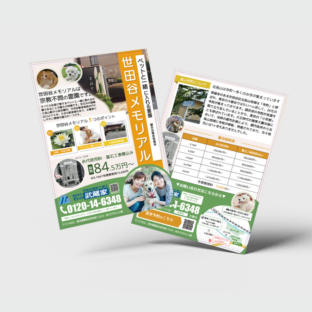 所々にペットの素材を入れてペットのお墓のチラシとわかるようにしております。