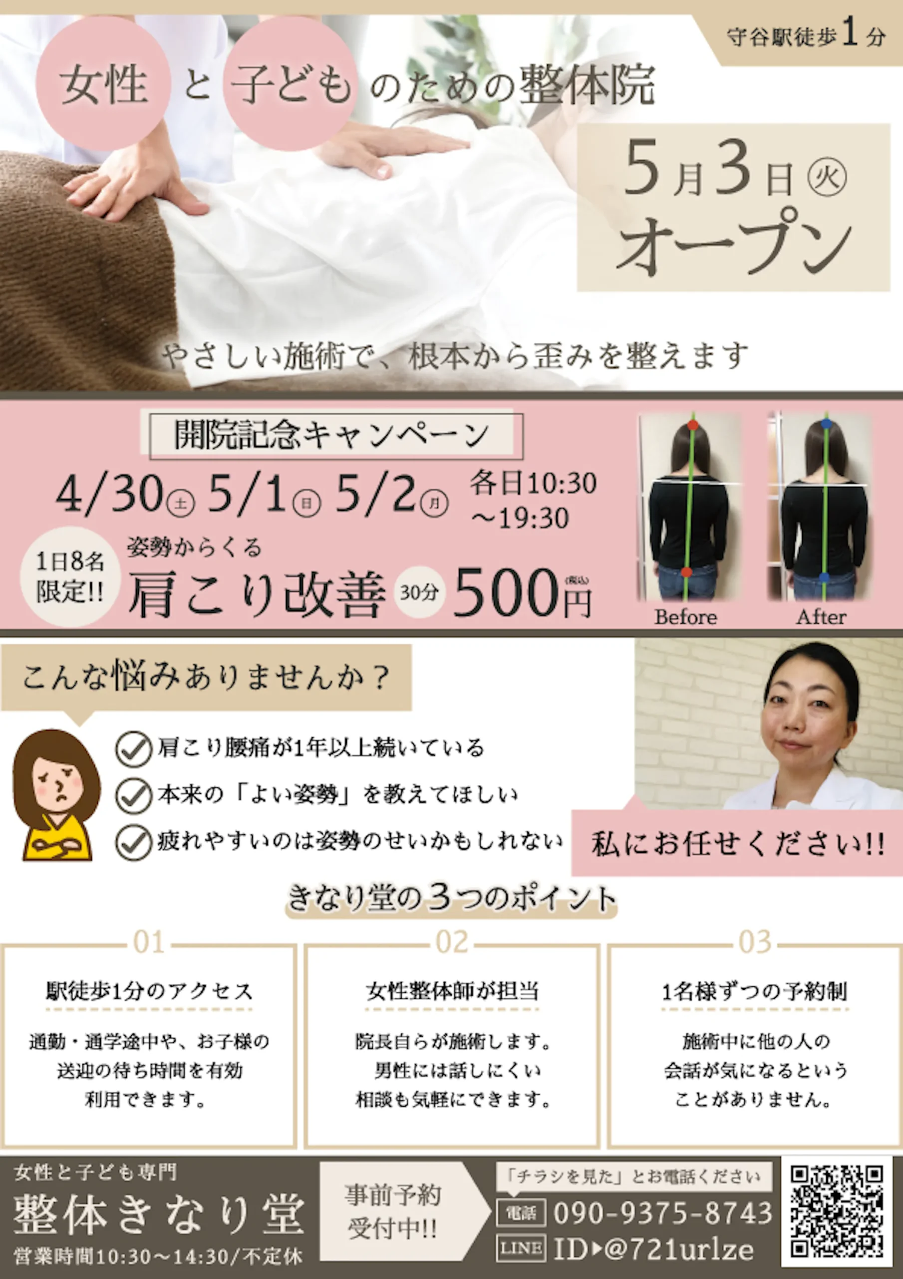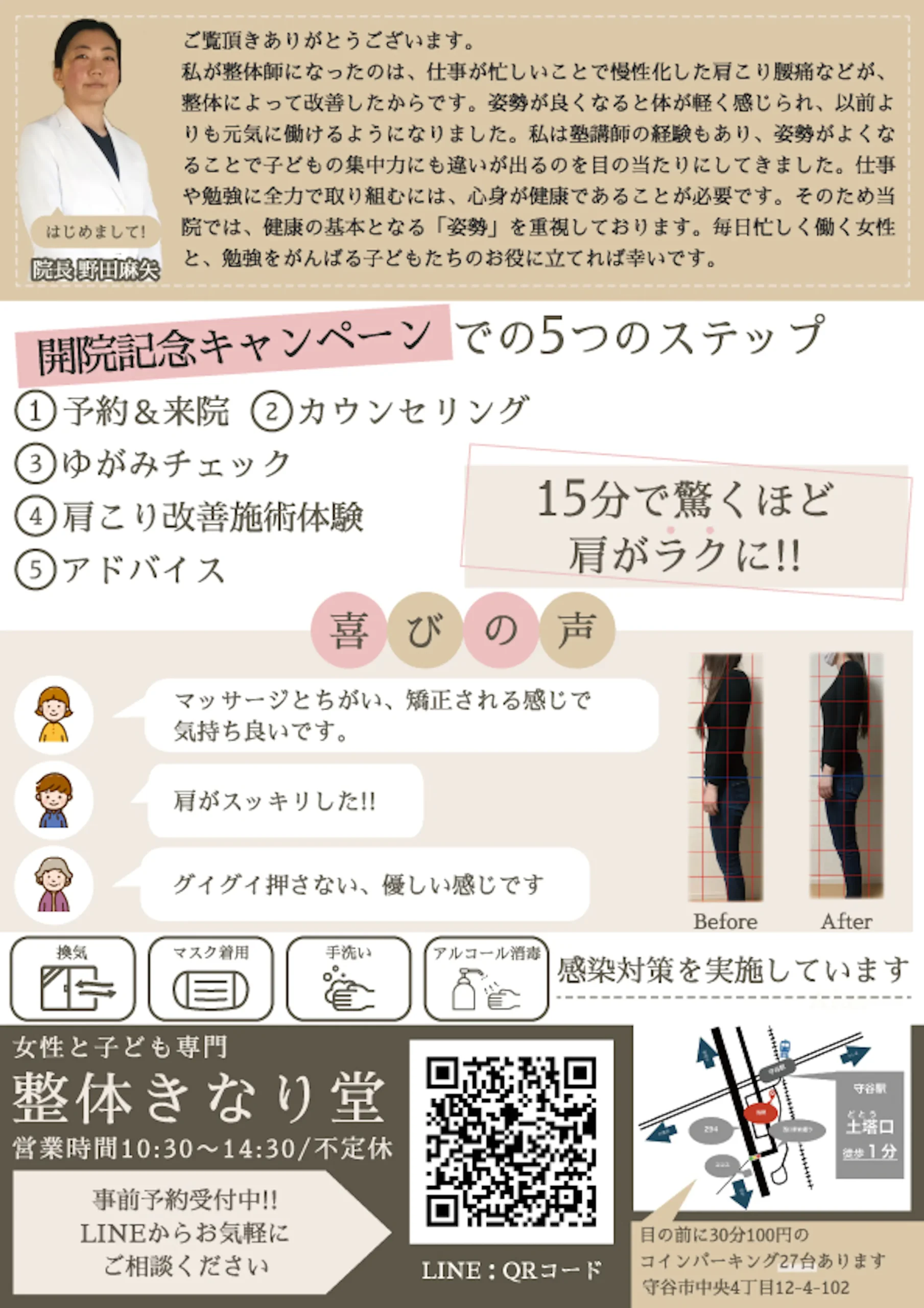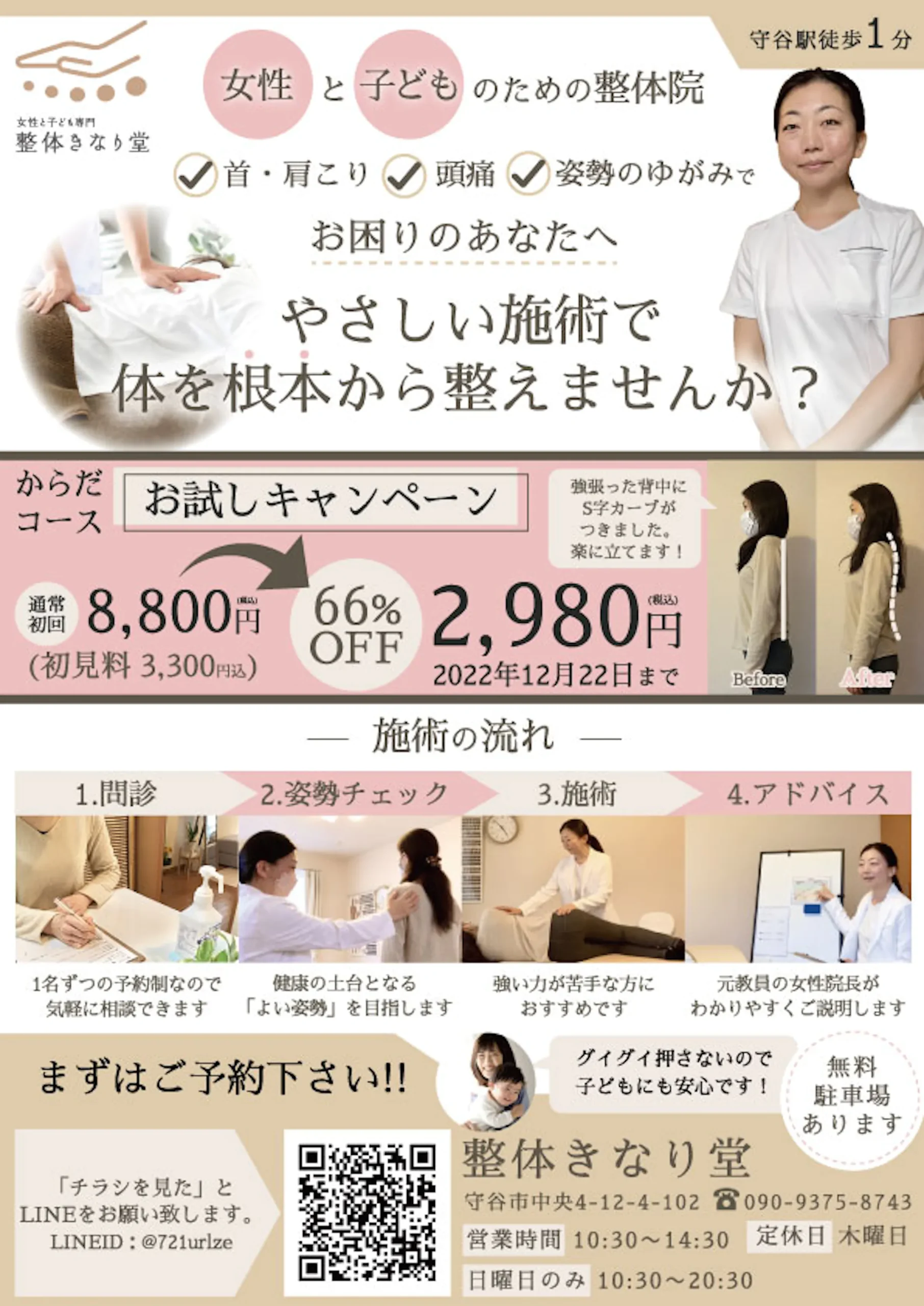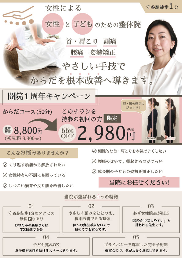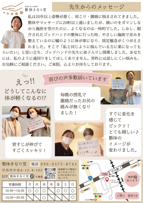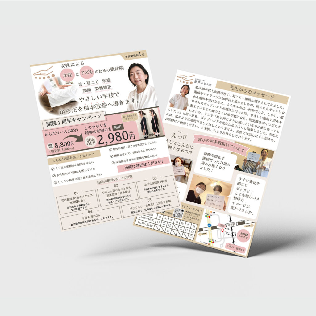 サイズ:A4 目的:集客 印刷会社:プリントパック ターゲット:30代以上女性(仕事や家事が忙しい) 配布方法:ポスティングデザインの雰囲気:前回のチラシが好評だったので前回と同じで